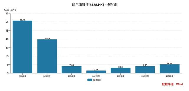 从上图可以看出,哈尔滨银行的归母净利润在连续大幅下降之后,近几年开始缓慢回升。但2024年9.2亿元的归母净利润仍较2018年的55.49亿元,有较大差距。